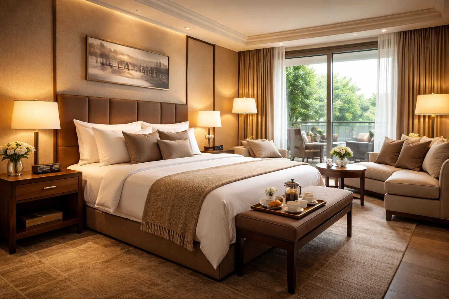 Затишний номер підвищеної категорії з м’яким освітленням, великим ліжком, окремою зоною для відпочинку та деталями для комфортного перебування. Підійде для сторінки готелю, комплексу або ресторану з номерами.